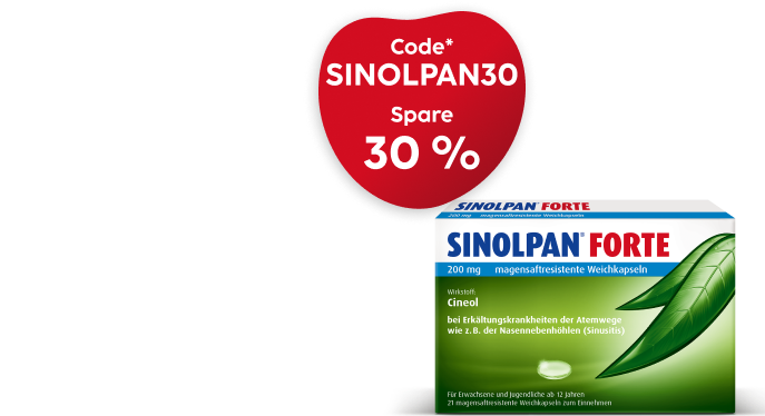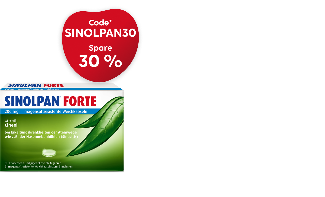 *Der Gutscheincode SINOLPAN30 ist gültig vom 01.10.2025 bis zum 31.03.2026 für Bestellungen der Aktionsprodukte mit den PZN 13816944 und 13816950, soweit es sich um nicht verschreibungspflichtige, nicht auf Rezept abgegebene Produkte handelt. Die Einlösung ist nur mit einem aktiven Benutzerkonto möglich. Der Gutschein wird nur bei Eingabe des Gutscheincodes im Warenkorb während des Bestellprozesses berücksichtigt. Mit Eingabe des Gutscheincodes im Bestellprozess erhältst du 30% Rabatt auf den Kaufpreis der genannten Aktionsprodukte. Der Rabatt wird automatisch im Warenkorb vom Rechnungsbetrag abgezogen. Eine nachträgliche Anrechnung des Gutscheincodes ist ausgeschlossen. Pro Person ist nur eine Einlösung möglich. Der Gutschein ist nicht mit anderen Aktionen oder Gutscheinen kombinierbar und kann nicht in bar ausgezahlt werden. Die Einlösung ist ausschließlich im Onlineshop unter https://www.gesund.de/produkt/159189-sinolpan-forte-200-mg-magensaftres-weichkapseln möglich und gilt nur, solange der Vorrat reicht.